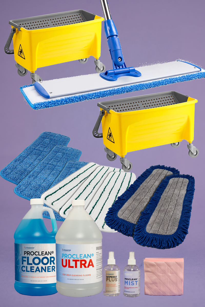 The Stagestep FloorCareTM Ultra+ Kit is the most advanced and complete cleaning system offered to the dance studio industry, designed for studios that demand top-tier performance and control over their floor maintenance. This all-inclusive bundle features the full Ultra Kit, including an 18" microfiber mop, two 22" wide, 11-gallon buckets with a scrub board and rinse grid, castor wheels and drain spout, and a large supply of wet, scrubber, and dust pads, along with Stagestep’s full lineup of cleaning solutions.